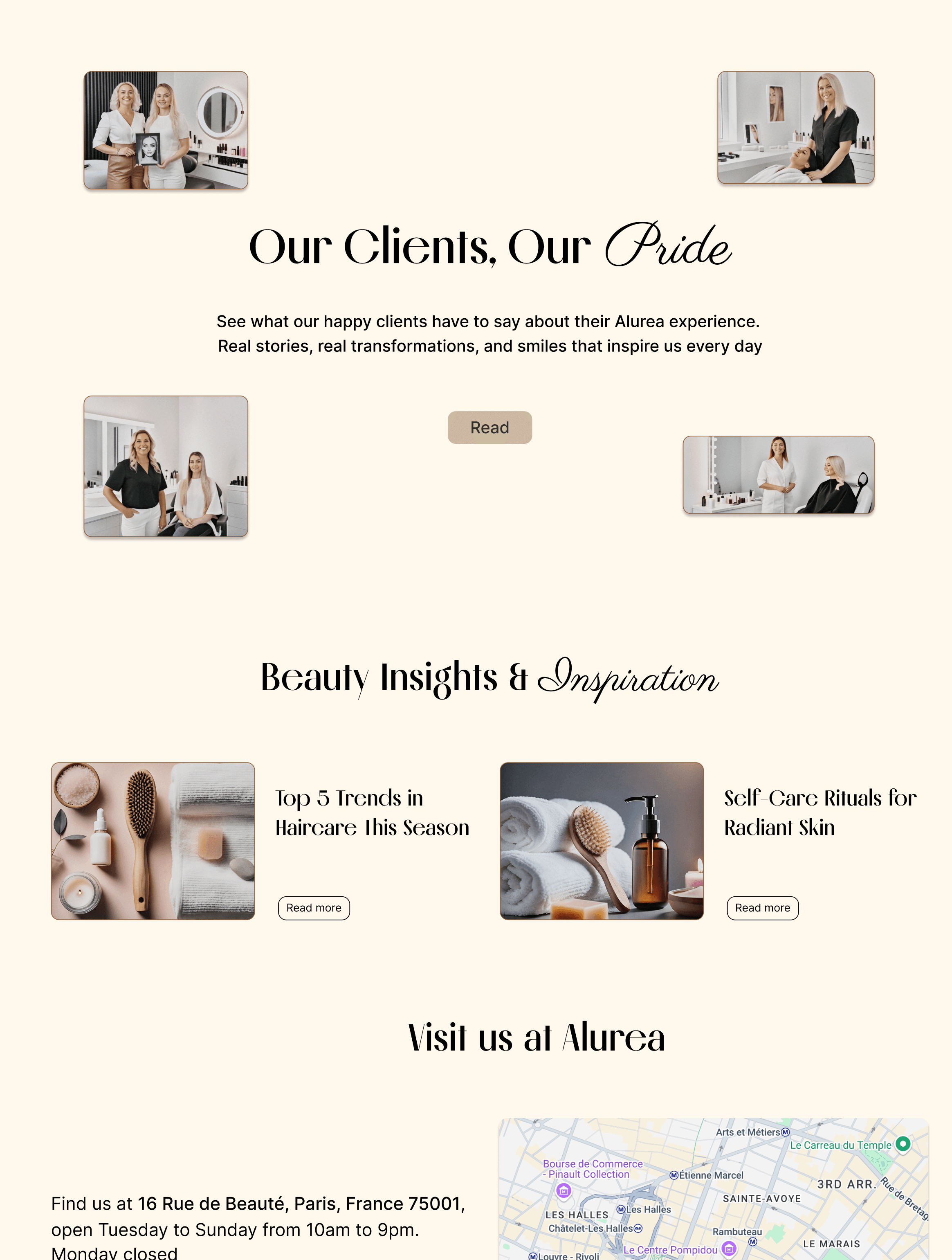 Brief About the Brand: Alurea is a luxury salon in Paris that offers high-end beauty and wellness services. They wanted a website and brand identity that felt modern, professional, and made clients feel special and confident. Our Thoughts: We wanted to create a simple, elegant design that highlights their services and gives a sense of luxury and care. What We Designed: We designed a sleek, responsive website, a stylish logo, a soft and elegant color palette, and branding assets to reflect their premium identity.